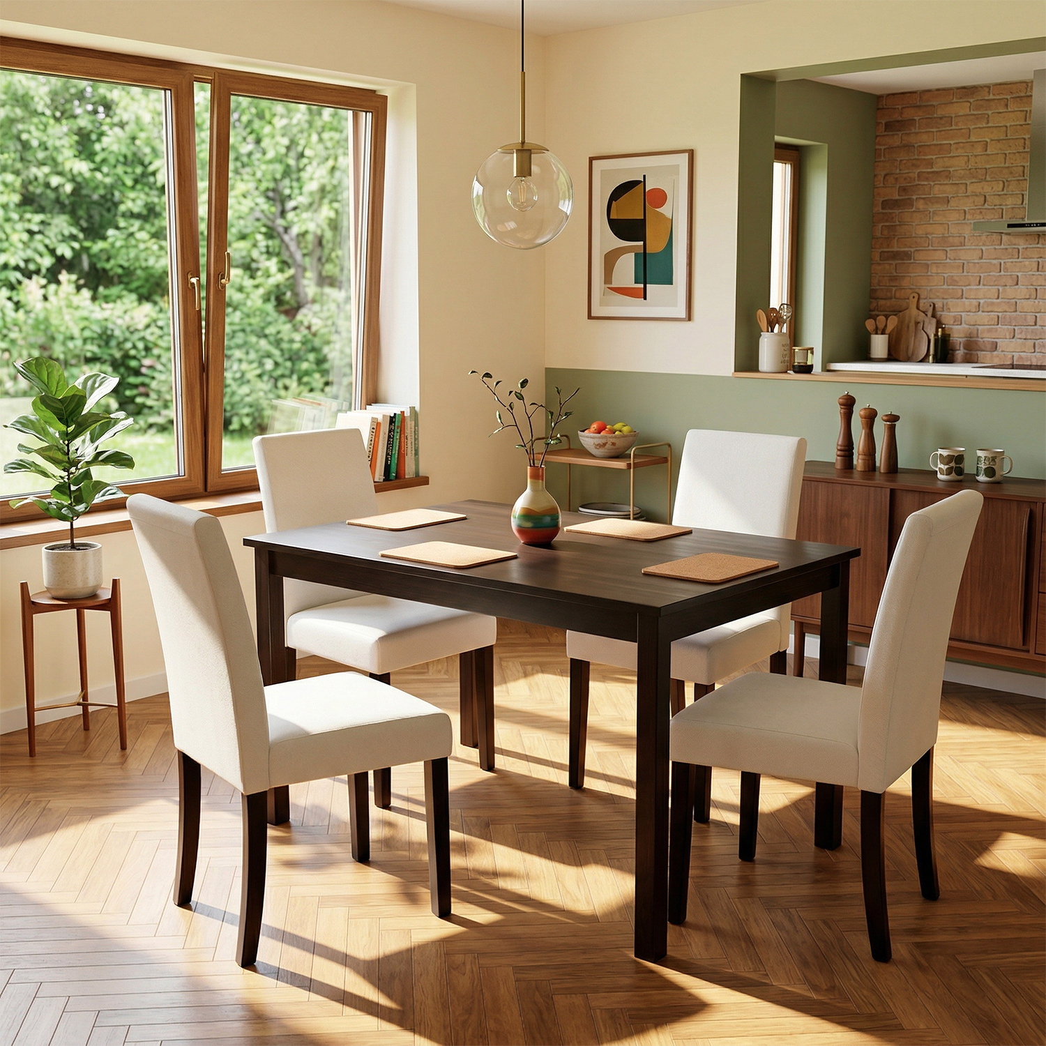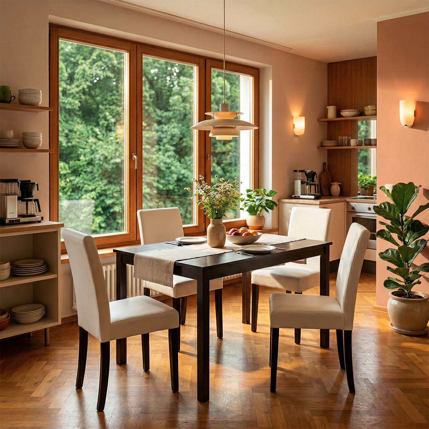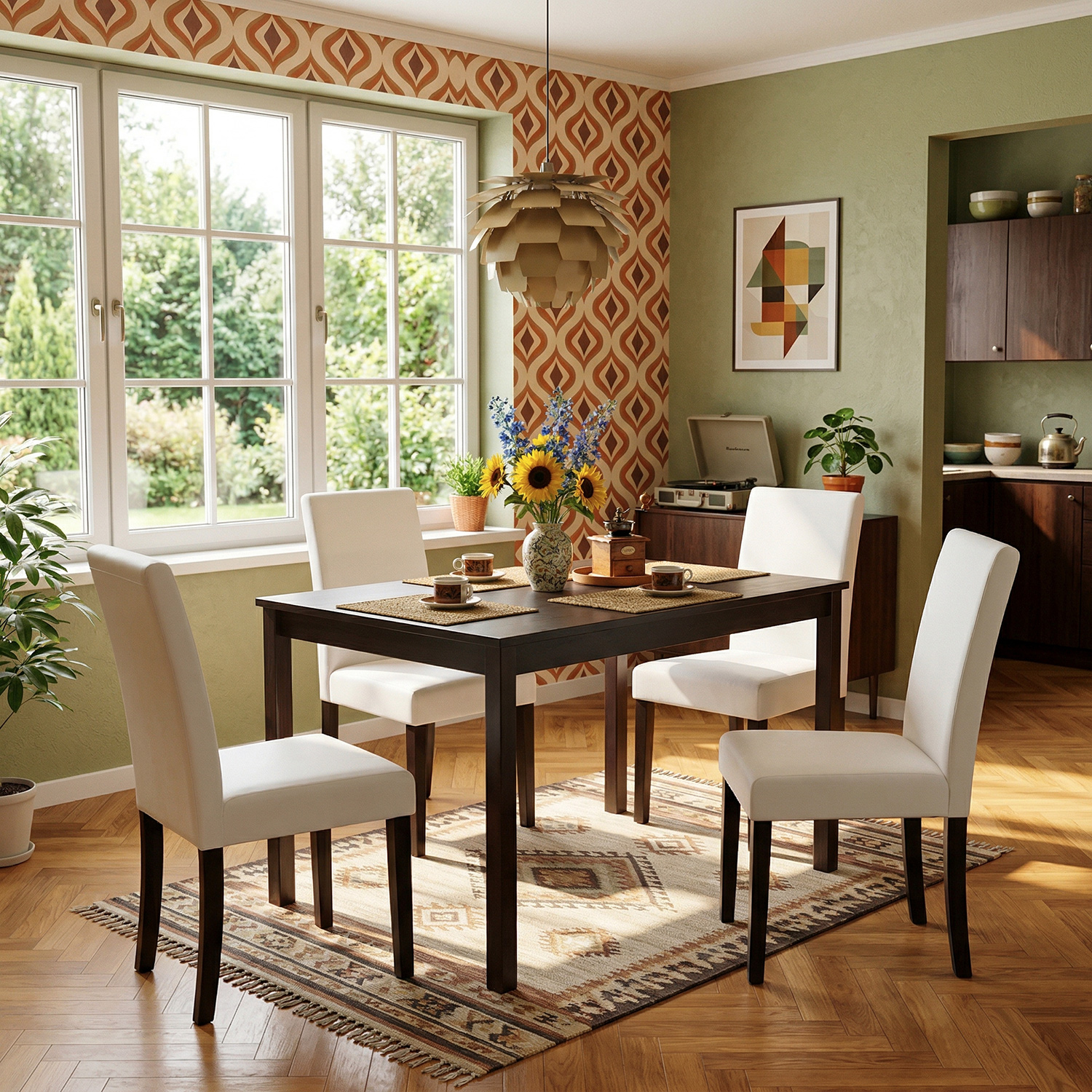 Jídelní sety s dřevěným stolem a židlemi s potahem z imitace kůže nabízí neokoukanou a u zákazníků velice oblíbenou kombinaci. Jídelní set 4425 je právě takovouto nadčasovou kombinací, která nikdy neomrzí. Židle s bílým potahem z imitace kůže vypadají velice luxusně a nebudou vás studit jako jejich moderní kolegyně z plastu. Stůl v provedení masiv v tmavě hnědém barevném provedení dokonale souzní právě se židlemi s bílým potahem. Vysoké opěrky zad židlí a nohy z masivu zajišťují strávníkům pohodlné a kvalitní sezení v rodinném kruhu. Jídelní set 4425 však uspokojí svým jednoduchým designem i majitele restaurací či kaváren. Pěkný jídelní set poskytne spoustu místa nejen u rodinné večeře, ale také při společném psaní domácích úkolů. Vytvořte si praktický kout k jídlu, práci i odpočinku.