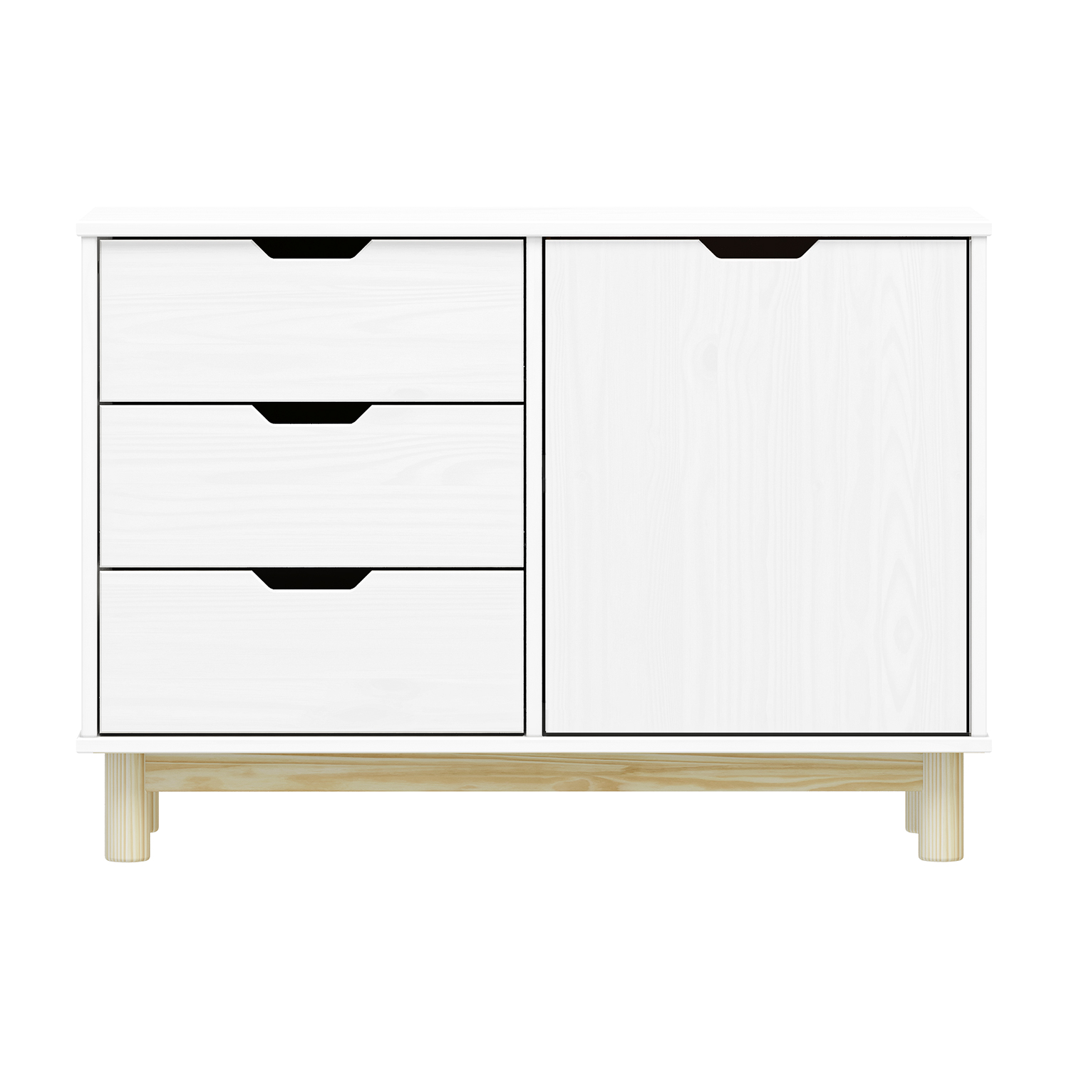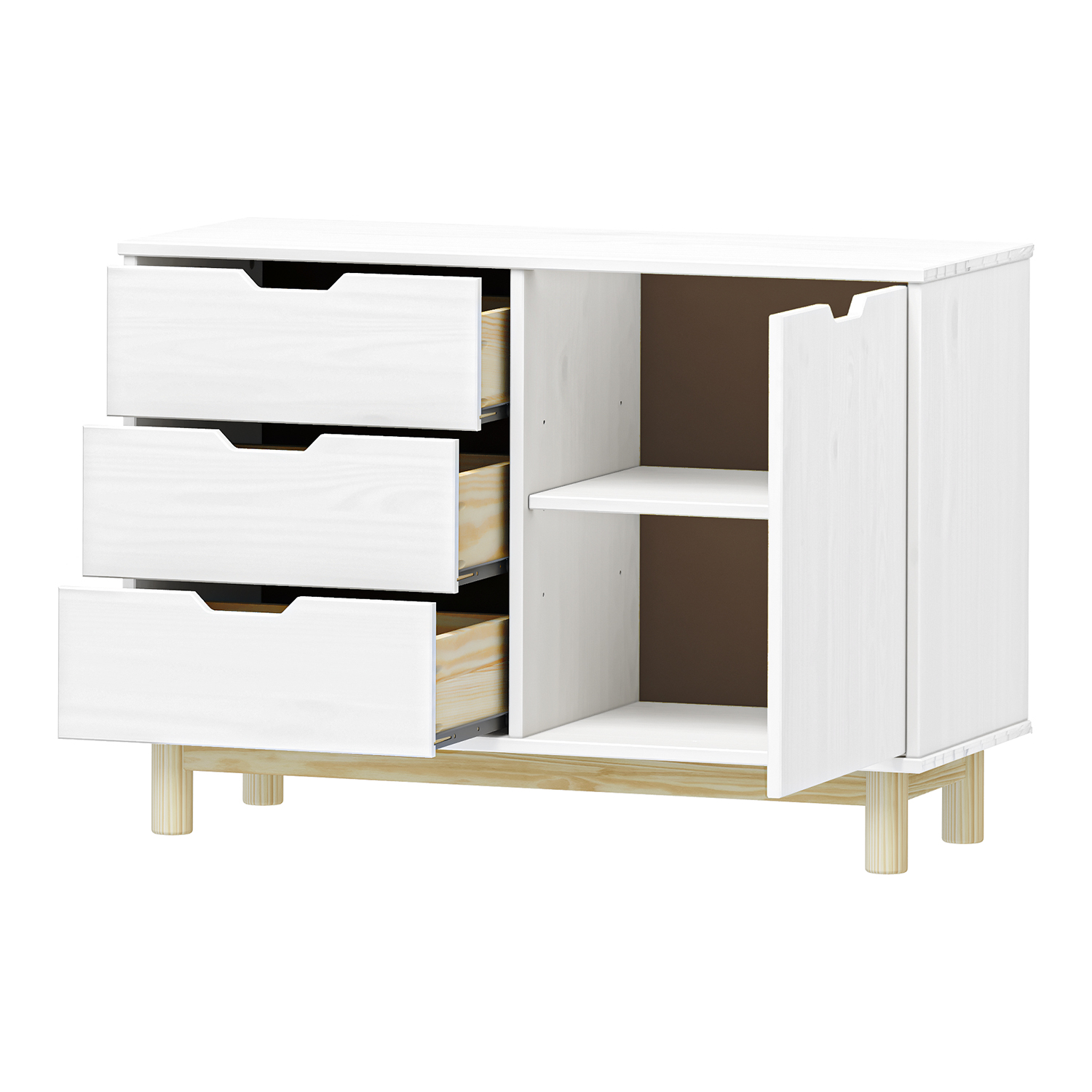 Kód produktu: 324291Vmateriál masiv borovice, lakované provedení 3 zásuvky s kovovými pojezdy, 2 dvířka, 1 police