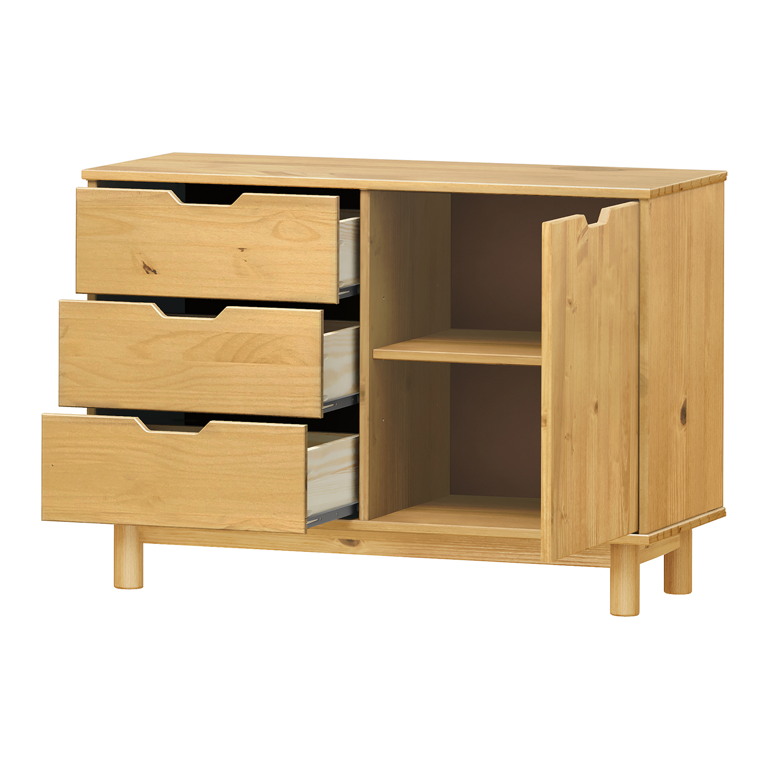 Kód produktu: 324291Vmateriál masiv borovice, lakované provedení 3 zásuvky s kovovými pojezdy, 2 dvířka, 1 police