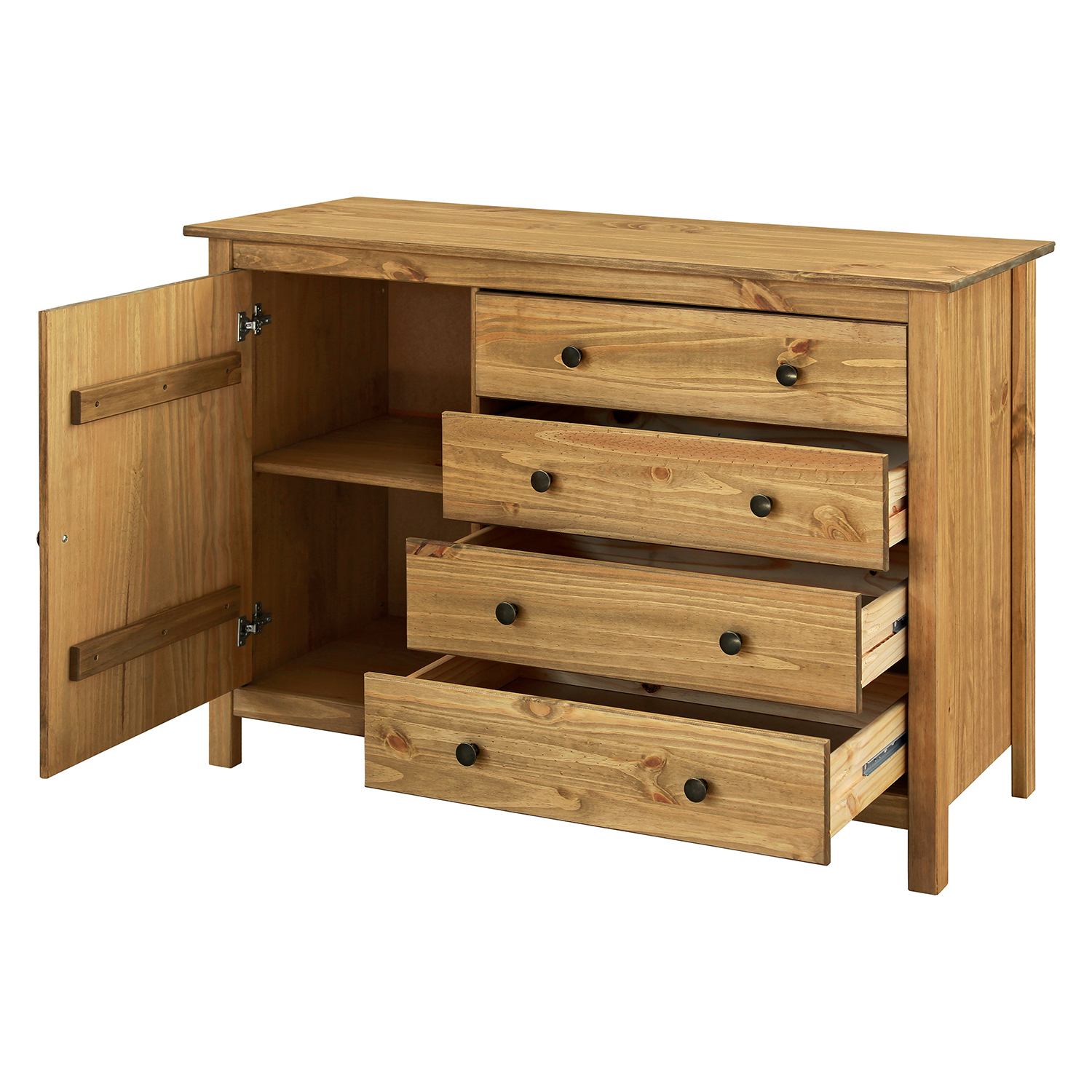 Kód produktu: 8092Vmateriál masiv borovice voskovaná v medovém odstínu kovové úchytky v barevném provedení černěná mosaz 4 zásuvky s kovovými pojezdy, 2 plné dveře, 1 police