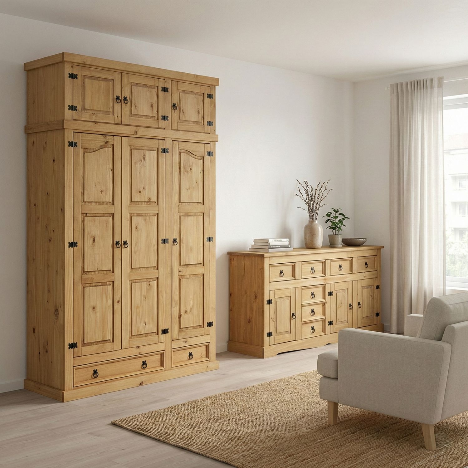 Kód produktu: 16347materiál masiv borovice voskovaná v medovém odstínu 4 malé, 3 střední a 2 velké zásuvky, kovové ozdobné úchytky součást sestavy Corona