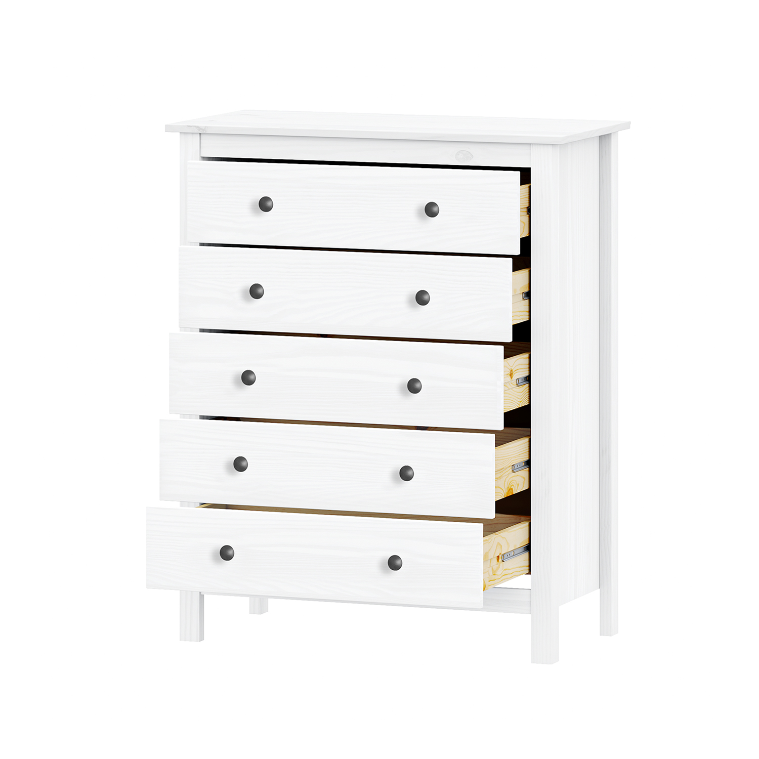 Kód produktu: 9131BKmateriál masiv borovice, barevné provedení bílý lak kovové úchytky v barevném provedení černěná mosaz čtyři zásuvky s kovovými pojezdy