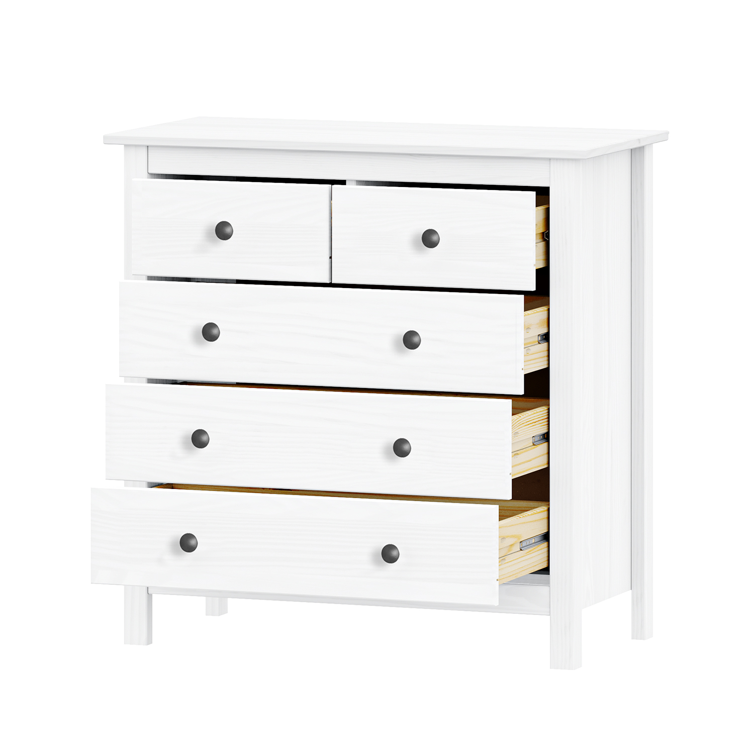 Komoda je vyrobena z masivní borovice a opatřena bílým lakem, který jí dodává svěží a elegantní vzhled. Tento kus nábytku je navržen tak, aby kombinoval styl s praktičností, a tím se stal ideálním doplňkem pro každý interiér. Komoda je vybavena kovovými úchytkami, které nejenže zvyšují její estetickou hodnotu, ale také zajišťují snadné otevírání a zavírání zásuvek. Má celkem pět zásuvek – dvě menší a tři větší – všechny s kovovými pojezdy, které umožňují hladký a tichý chod. Menší zásuvky jsou ideální pro ukládání drobností, jako jsou šperky, dokumenty nebo jiné menší předměty. Větší zásuvky poskytují dostatek prostoru pro oblečení, ložní prádlo nebo jiné větší předměty. Díky kombinaci kvalitního materiálu, praktického úložného prostoru a elegantního designu je tato komoda nejen funkčním, ale také stylovým doplňkem do vaší domácnosti.