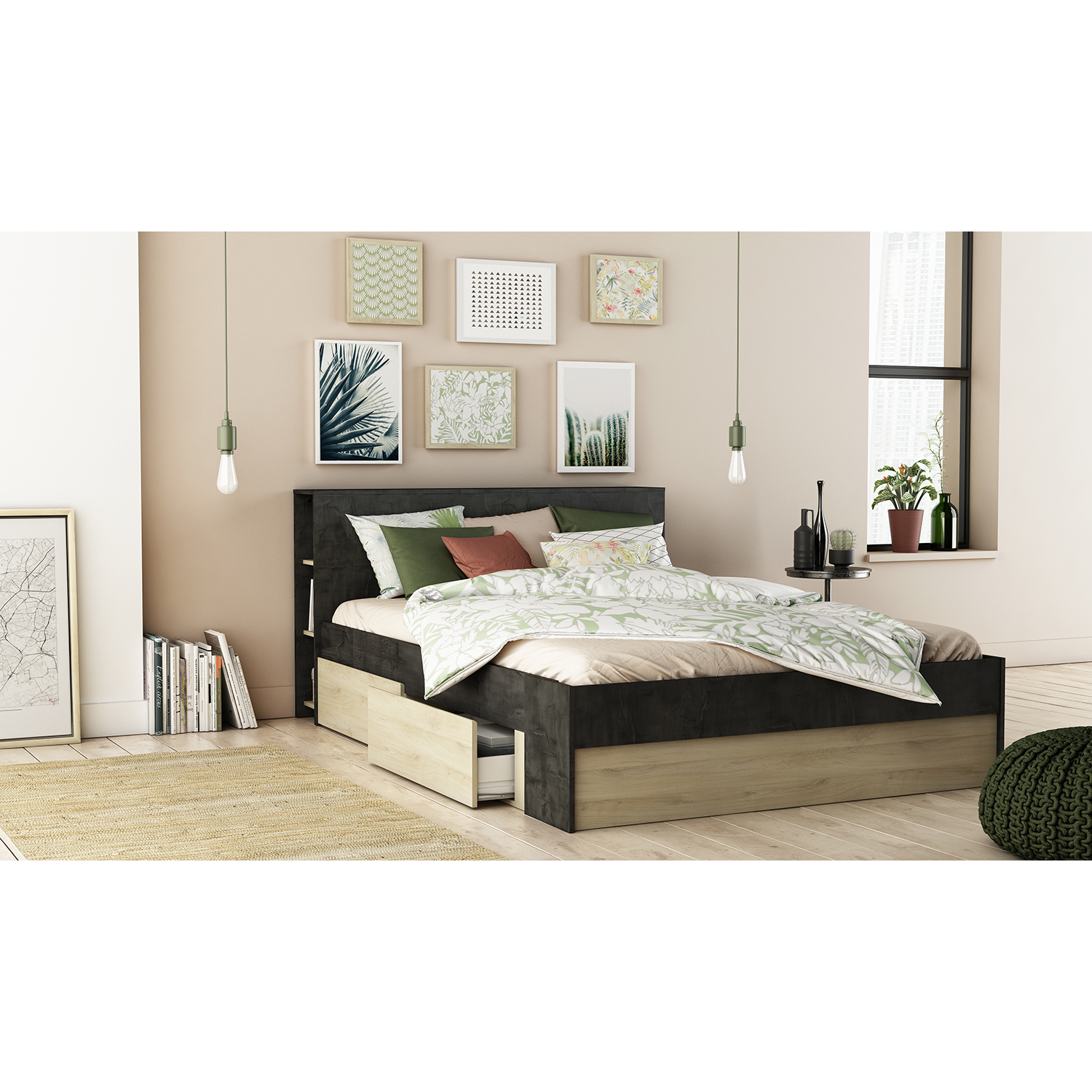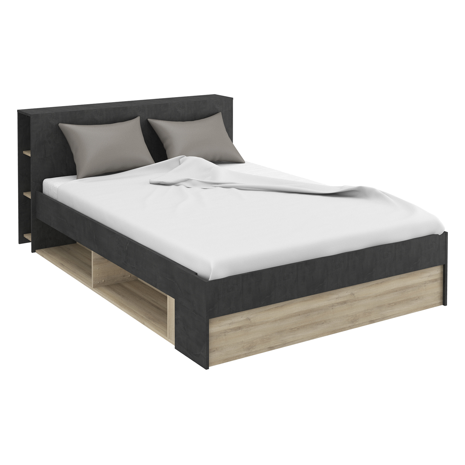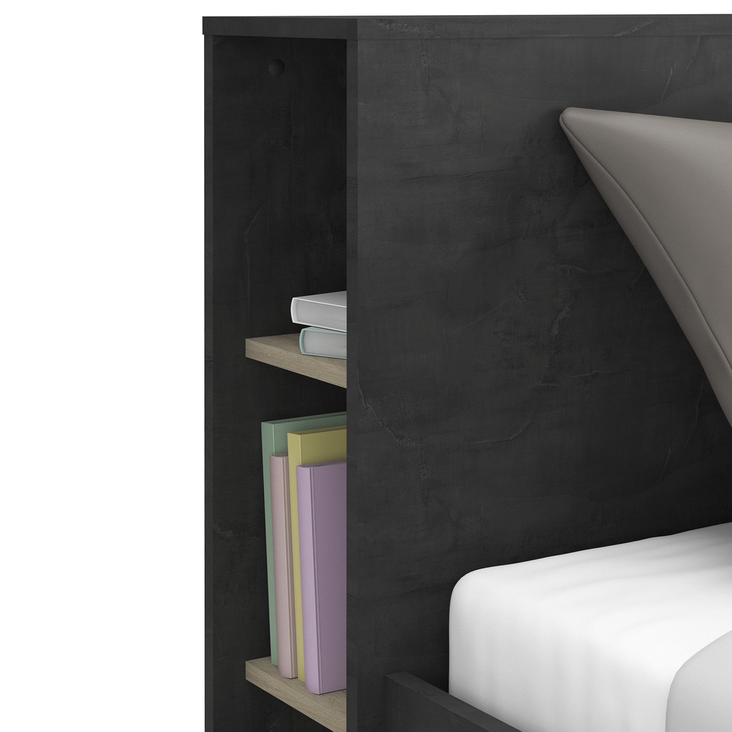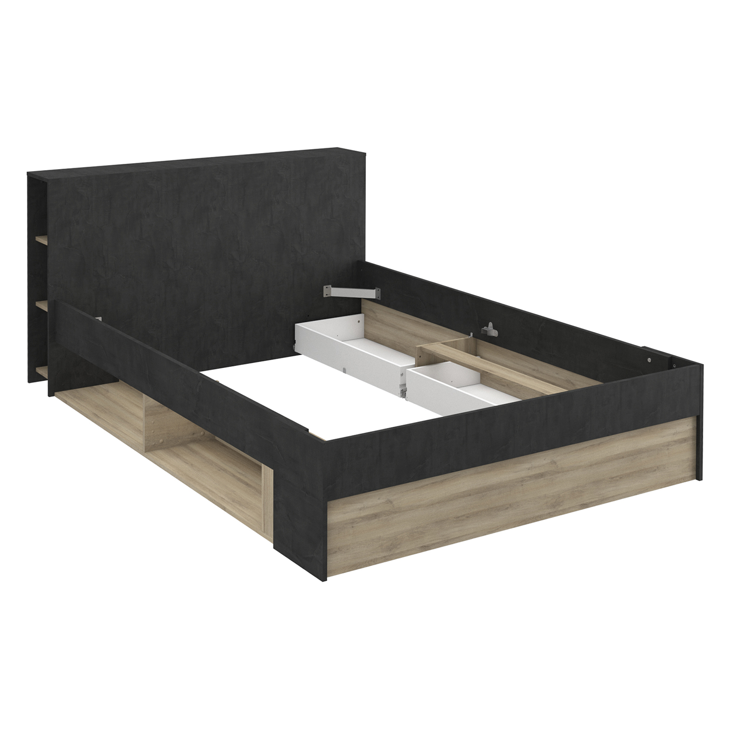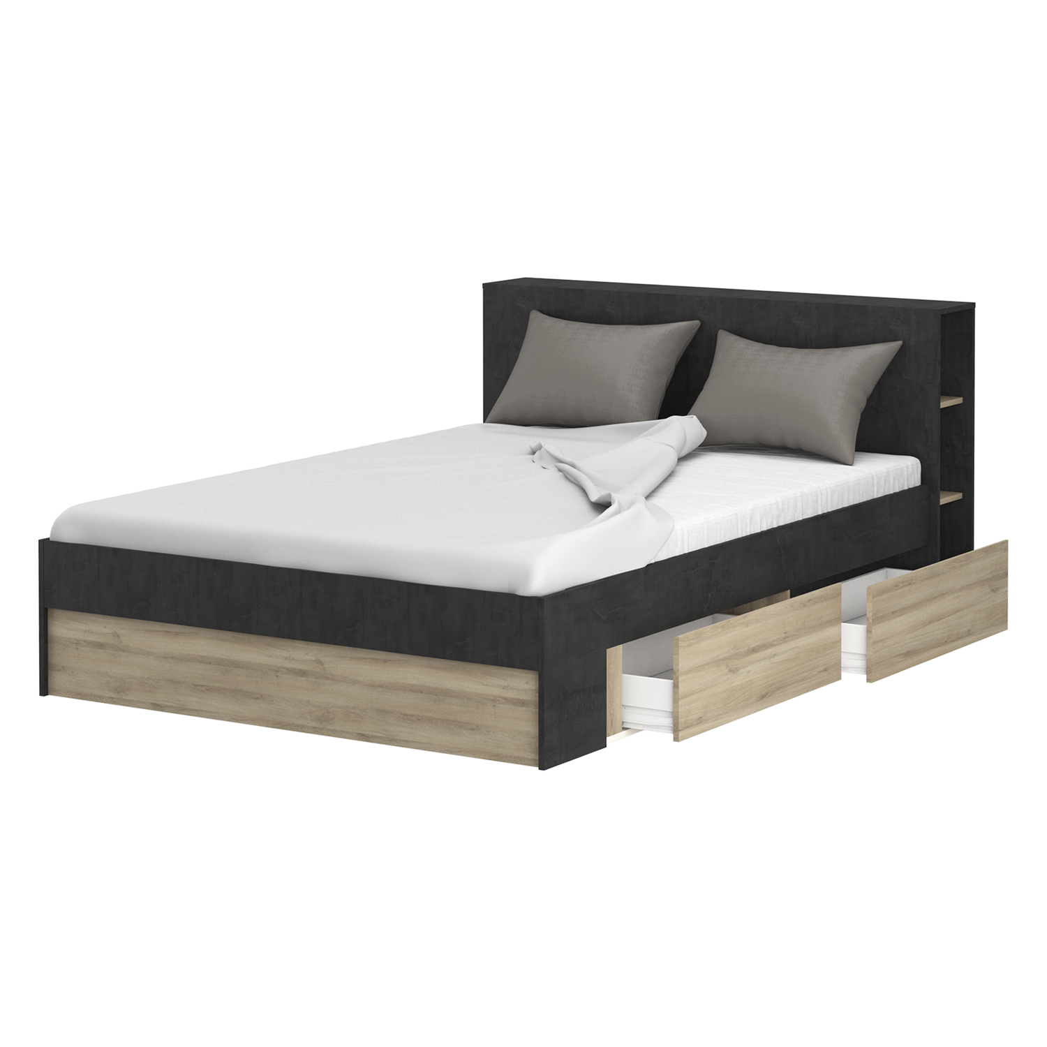 čelo postele slouží jako knihovna, 2 niky a 2 velké úložné zásuvky s kovovými pojezdy, montáž možná na obě strany
