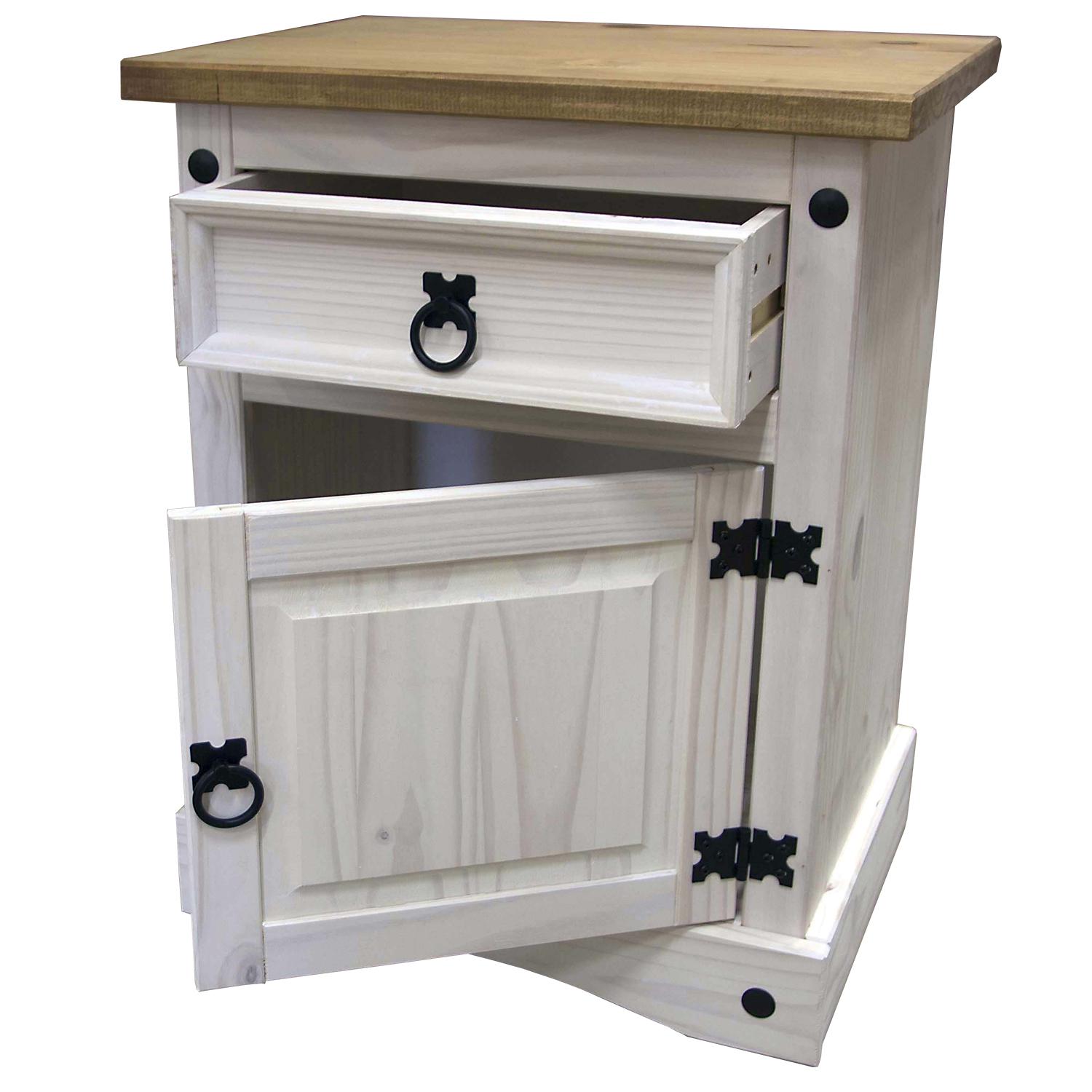 materiál masiv borovice voskovaná v bílém odstínu horní deska masiv borovice voskovaná v medovém odstínu 2 malé zásuvky, 1 police, kovové ozdobné úchytky součást sestavy Corona bílá