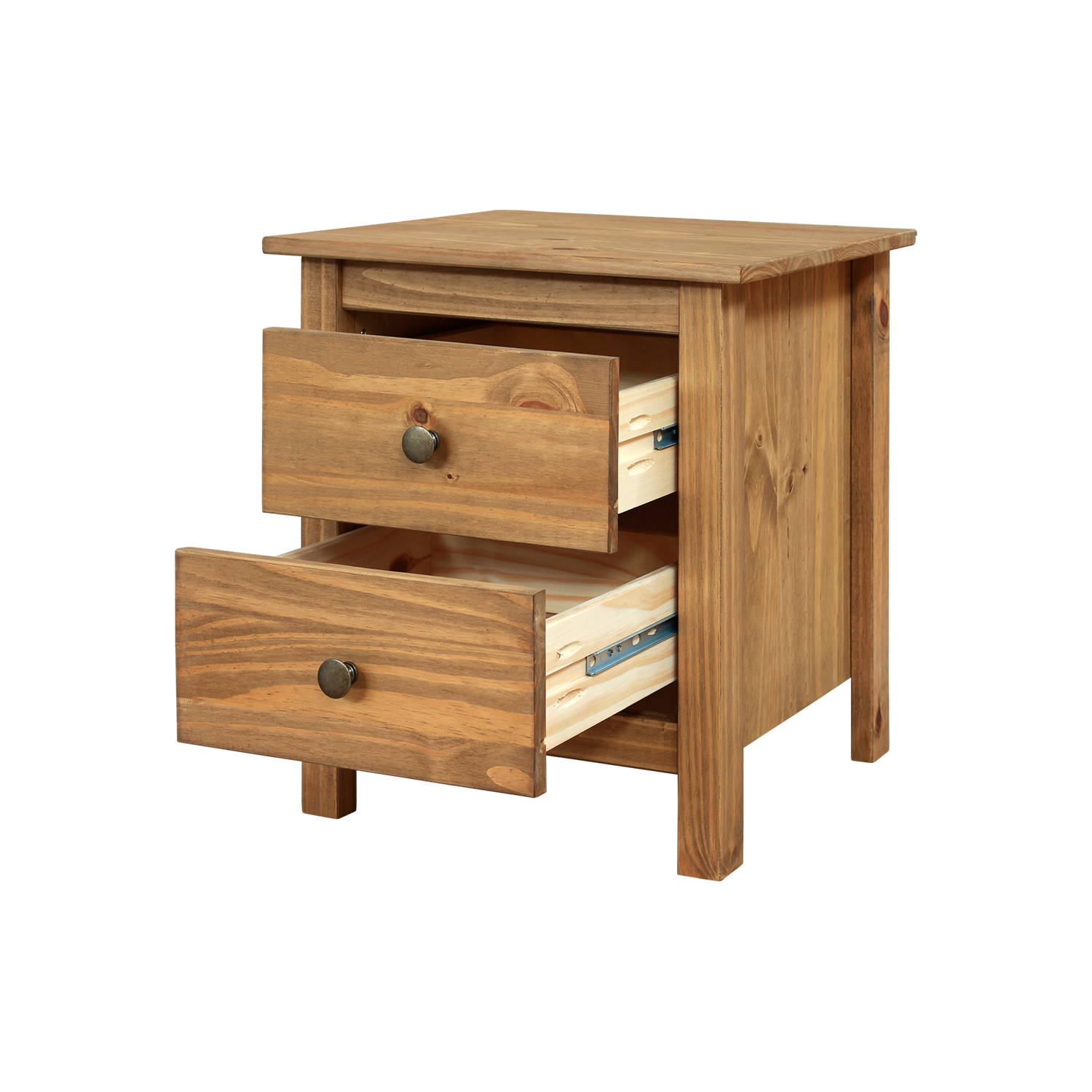 Kód produktu: 8095Vmateriál masiv borovice voskovaná v medovém odstínu kovové úchytky v barevném provedení černěná mosaz 2 zásuvky s kovovými pojezdy, 1 police maximální doporučené zatížení horní desky do 50 kg