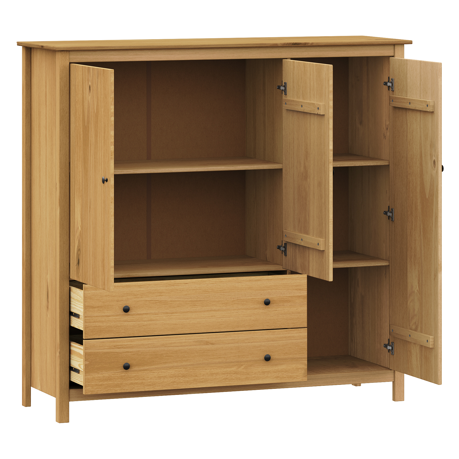 Kód produktu: 8061Vmateriál masiv borovice voskovaná v medovém odstínu kovové úchytky v barevném provedení černěná mosaz 3 zásuvky s kovovými pojezdy, 3 plné dveře, 2 police maximální nosnosti uvedeny v návodu k montáži