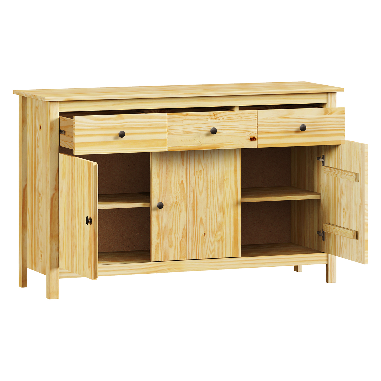 Kód produktu: 8061Kmateriál masiv borovice, lakované provedení kovové úchytky v barevném provedení černěná mosaz 3 zásuvky s kovovými pojezdy, 3 plné dveře, 2 police maximální nosnosti uvedeny v návodu k montáži