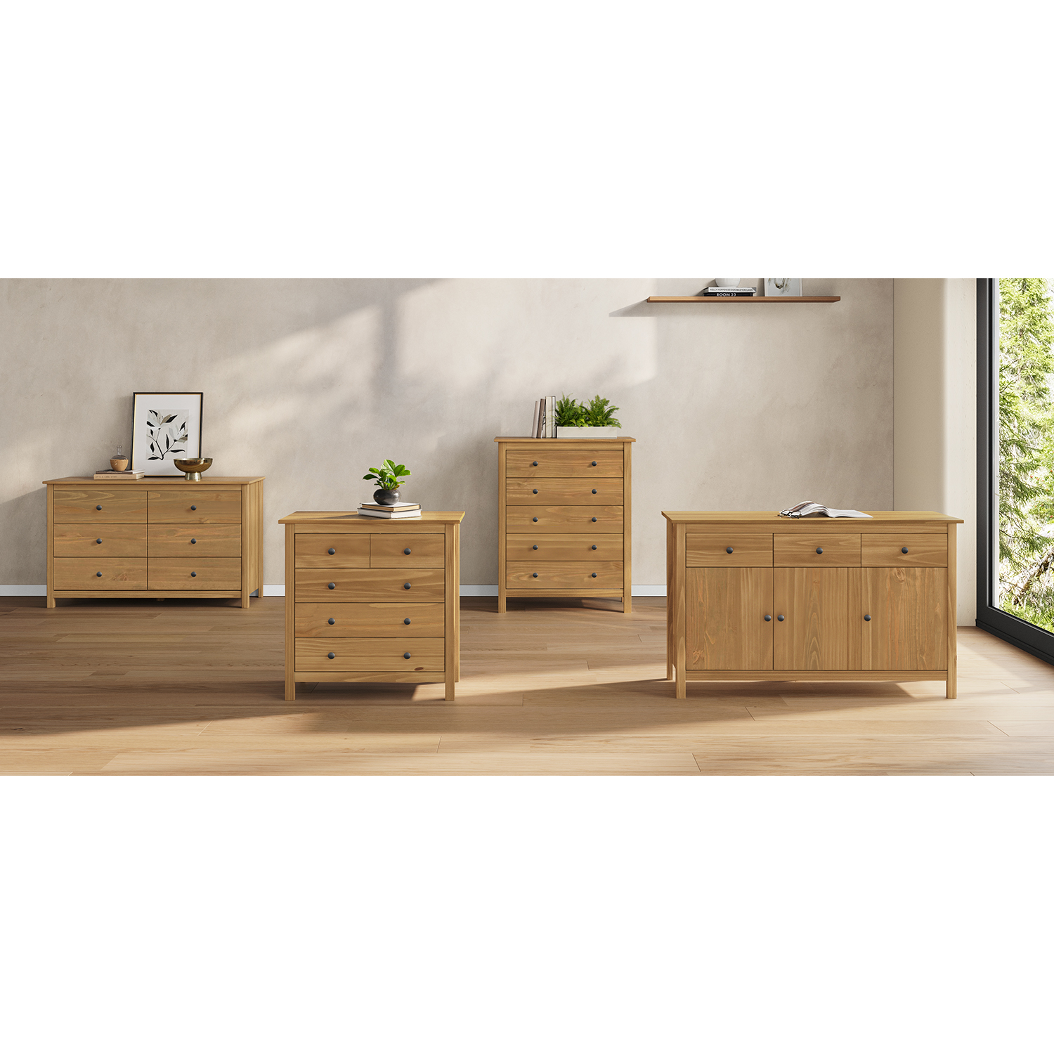 Kód produktu: 8092Vmateriál masiv borovice voskovaná v medovém odstínu kovové úchytky v barevném provedení černěná mosaz 4 zásuvky s kovovými pojezdy, 2 plné dveře, 1 police