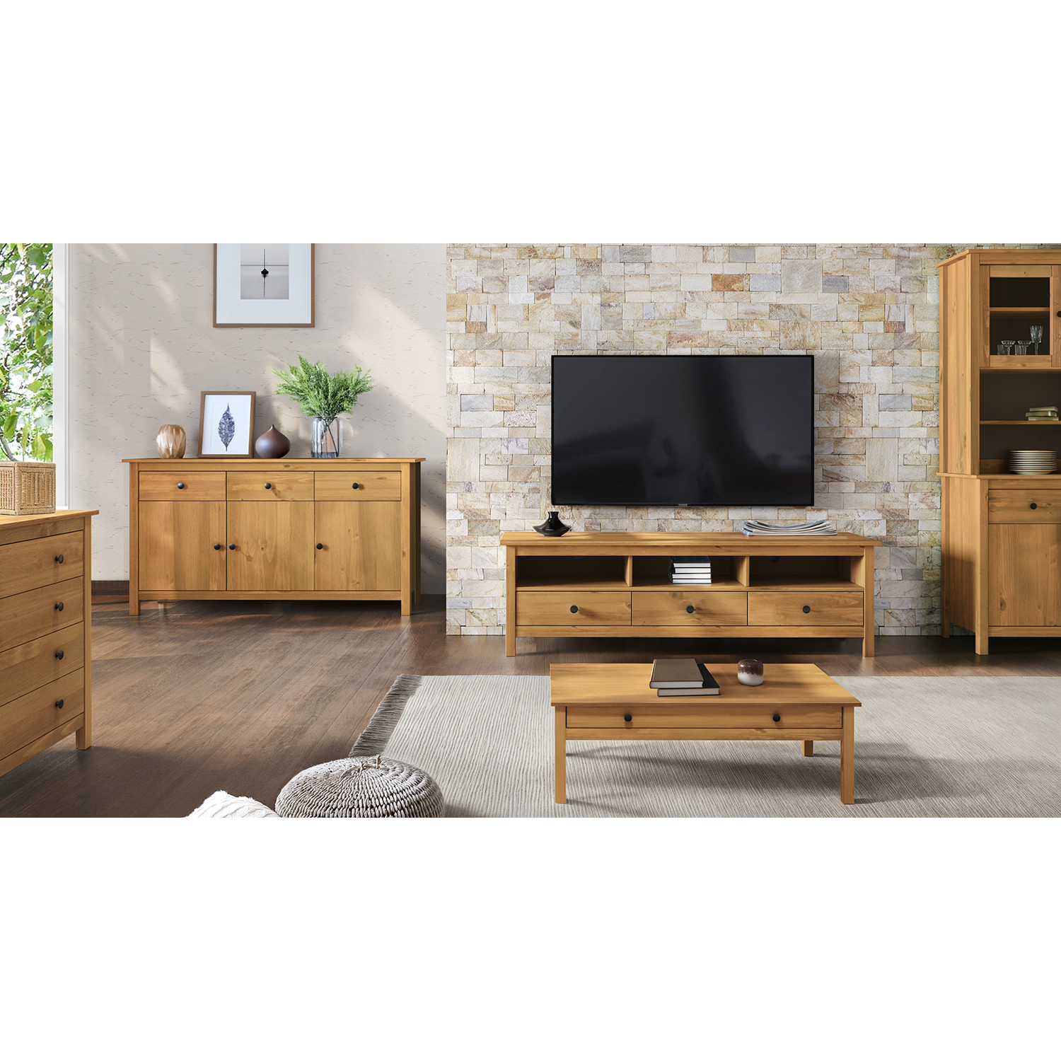 Kód produktu: 8061Vmateriál masiv borovice voskovaná v medovém odstínu kovové úchytky v barevném provedení černěná mosaz 3 zásuvky s kovovými pojezdy, 3 plné dveře, 2 police maximální nosnosti uvedeny v návodu k montáži