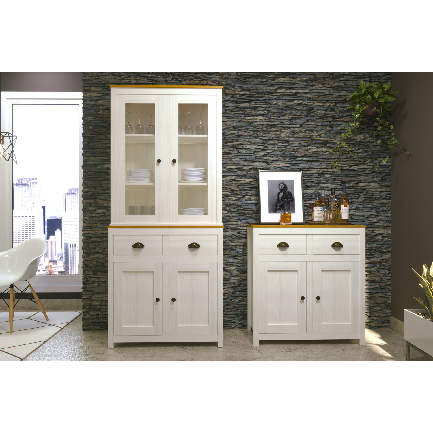 Kód produktu: 206401materiál masiv borovice, barevné provedení bílý / hnědý lak tři zásuvky s kovovými úchytkami a pojezdy troje plné a troje prosklené dveře