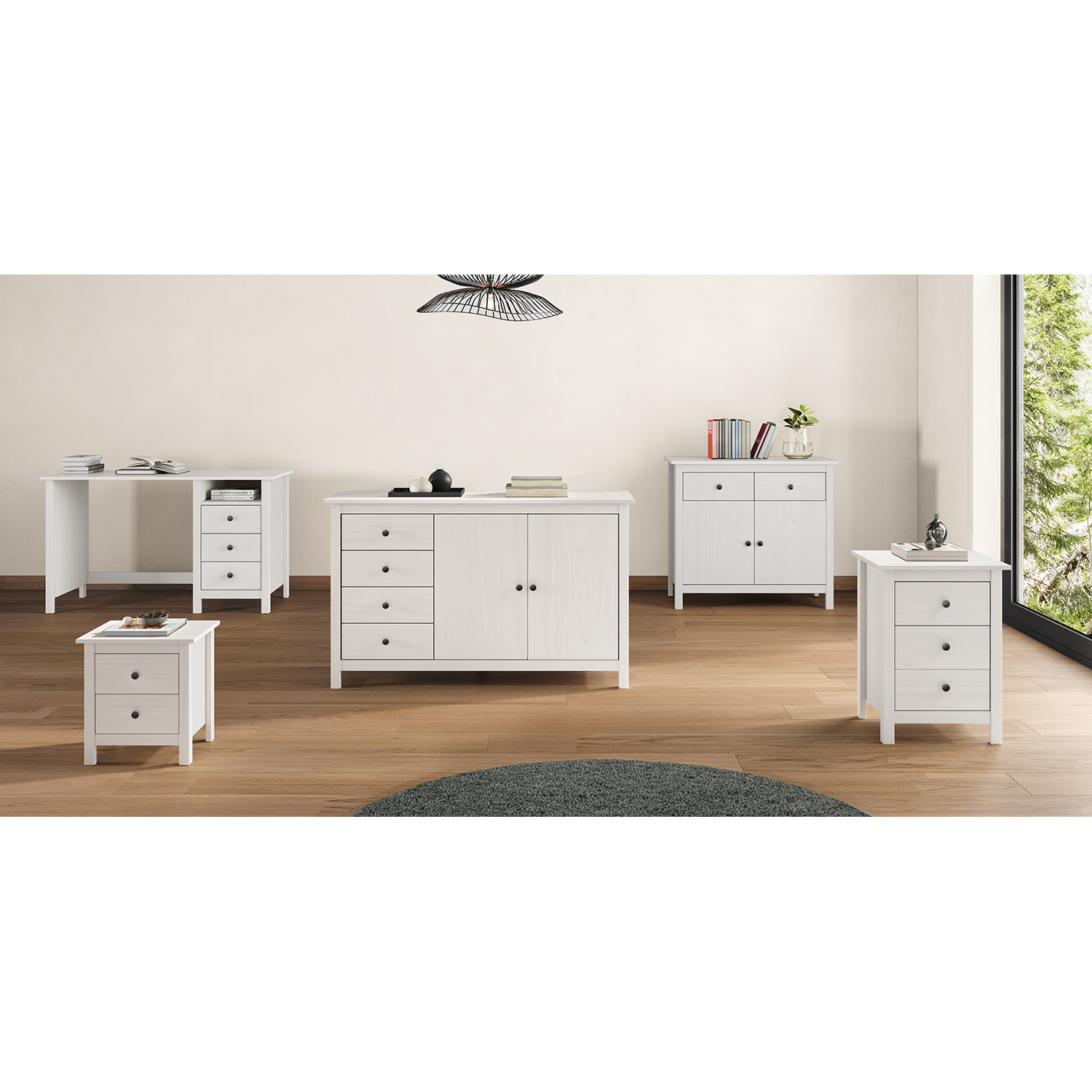 Kód produktu: 8091BKmateriál masiv borovice, barevné provedení bílý lak kovové úchytky v barevném provedení černěná mosaz široká zásuvka s kovovými pojezdy