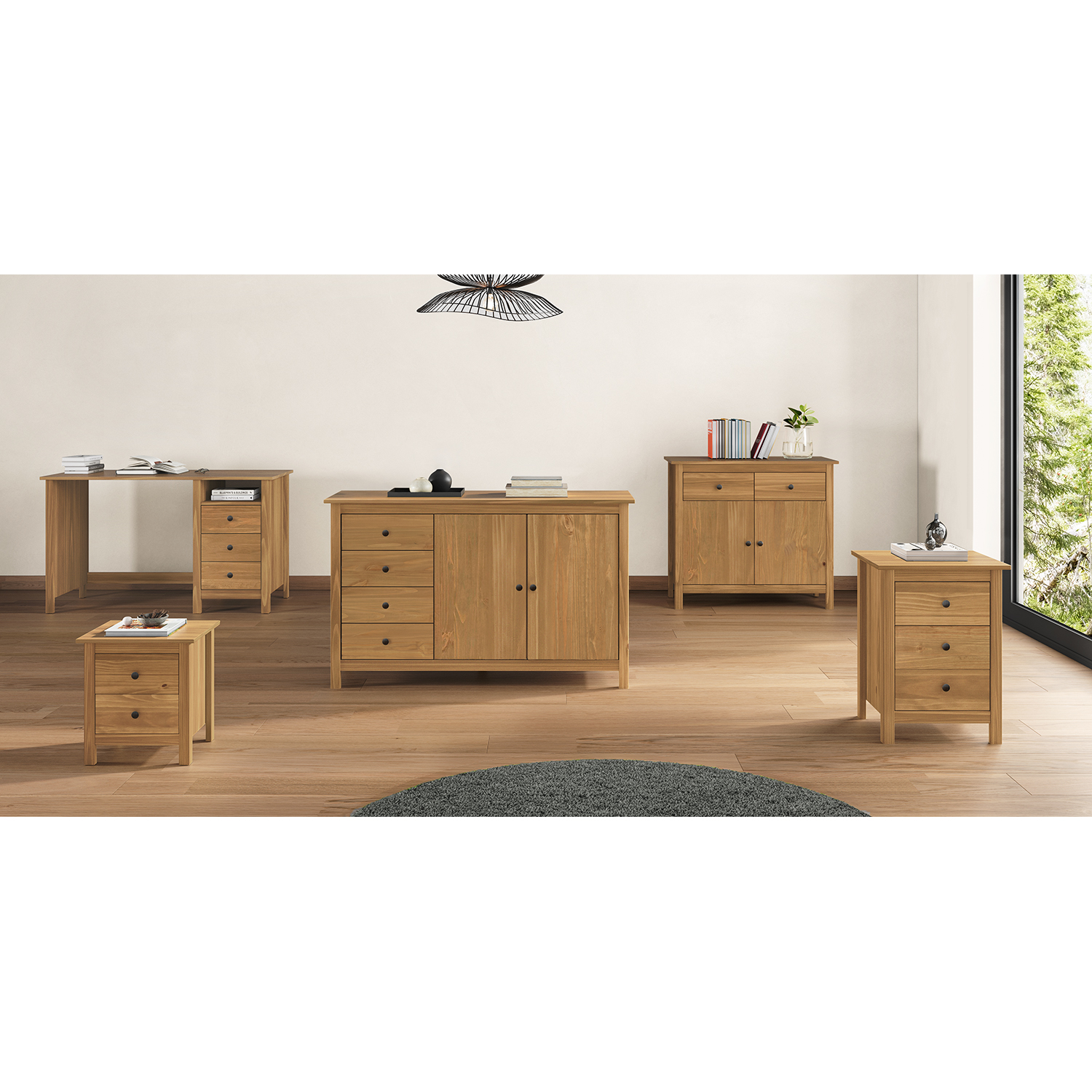 Kód produktu: 8092Vmateriál masiv borovice voskovaná v medovém odstínu kovové úchytky v barevném provedení černěná mosaz 4 zásuvky s kovovými pojezdy, 2 plné dveře, 1 police