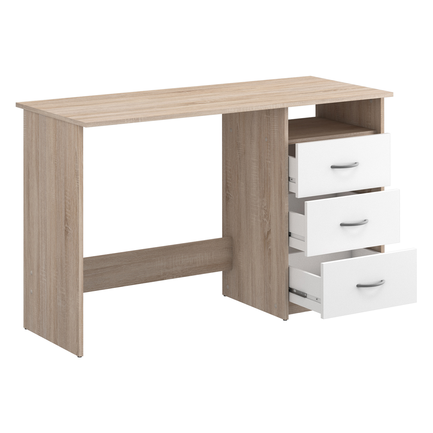 Pokud preferujete nábytek v pokoji laděný do světlých tónů dřeva či bílé, pak by ani váš stůl neměl být výjimkou. Psací stůl v barevné kombinaci dub Sonoma a matná bílá dokonale doplní nábytek ve stejném barevném provedení i podobném designu. Jednoduchý psací stůl potěší především dámy, které dávají přednost eleganci před praktičností a velkým množstvím nejrůznějších poliček a zásuvek. Tento stůl má totiž pouze jednu polici a tři bílé zásuvky s kovovými pojezdy, kdy montáž zásuvek je možná na pravou i levou stranu. Jednoduchý stolek krásně zapadne do vaší domácí pracovny, dětského pokoje, ale také díky barevnému provedení nenaruší klidovou atmosféru vaší ložnice. Pracujte i odpočívejte v jedné místnosti, pokoj sladěný do jemných barev vás nebude rušit od rozjímání ani náročné práce.