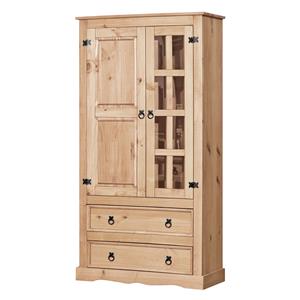 materiál masiv borovice voskovaná v bílém odstínu horní deska masiv borovice voskovaná v medovém odstínu prosklená část, 3 police, 1 plná dvířka, 2 velké zásuvky hloubka zásuvky 32 cm, kovové ozdobné úchytky součást sestavy Corona bílá